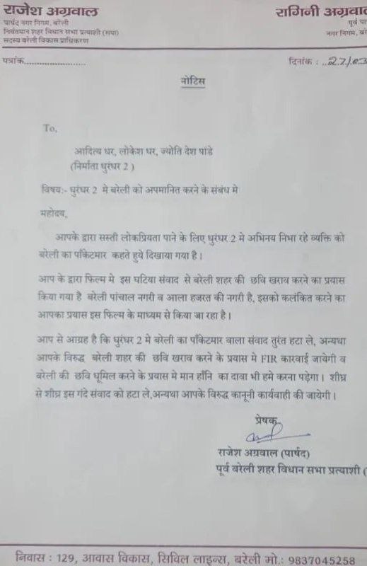 बरेली के रामपुर गार्डन क्षेत्र के पार्षद Rajesh Agrawal ने फिल्म के निर्माताओं को कानूनी नोटिस भेजकर विवादित डायलॉग को तुरंत हटाने की मांग की है।