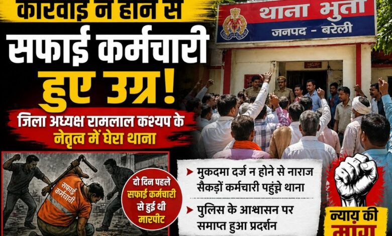 (बरेली):थाना भुता क्षेत्र के गांव सिसैया में सफाई कर्मचारी के साथ हुई मारपीट के मामले में कार्रवाई न होने से नाराज सफाई कर्मचारियों का गुस्सा शुक्रवार को फूट पड़ा। पंचायती राज ग्रामीण सफाई कर्मचारी संघ के बैनर तले सैकड़ों कर्मचारियों ने जिला अध्यक्ष रामलाल कश्यप के नेतृत्व में भुता थाने का घेराव कर जोरदार प्रदर्शन किया। इस दौरान नारेबाजी करते हुए कर्मचारियों ने पुलिस प्रशासन के खिलाफ रोष व्यक्त किया।