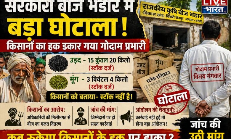 📍 बरेली, संवाददाता। विकासखंड बिथरी चैनपुर स्थित राजकीय कृषि बीज भंडार में भारी अनियमितता और भ्रष्टाचार का मामला उजागर हुआ है। आरोप है कि गोदाम प्रभारी ने किसानों के लिए आए सरकारी बीज का बंदरबांट कर लिया, जिससे कई पात्र किसान बीज से वंचित रह गए।
