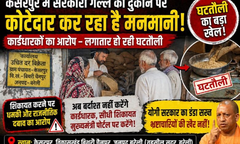 📍 बरेली, संवाददाता। विकासखंड बिथरी चैनपुर की ग्राम पंचायत केसरपुर में सरकारी गल्ले की दुकान को लेकर गंभीर अनियमितताओं का मामला सामने आया है। ग्रामीणों और कार्डधारकों ने कोटेदार पर घटतौली और मनमानी करने के आरोप लगाए हैं, जिससे क्षेत्र में रोष का माहौल है।