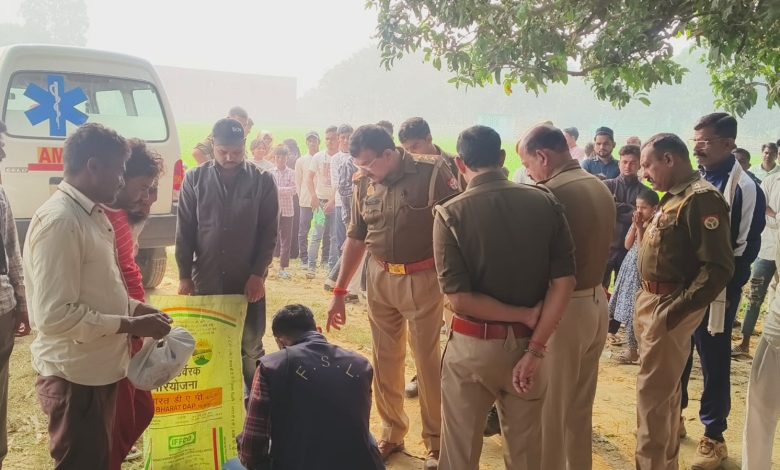 गांव मनौना में युवक की पत्थर से कुचल कर हत्या, पुलिस व फॉरेंसिक टीम मौके पर।