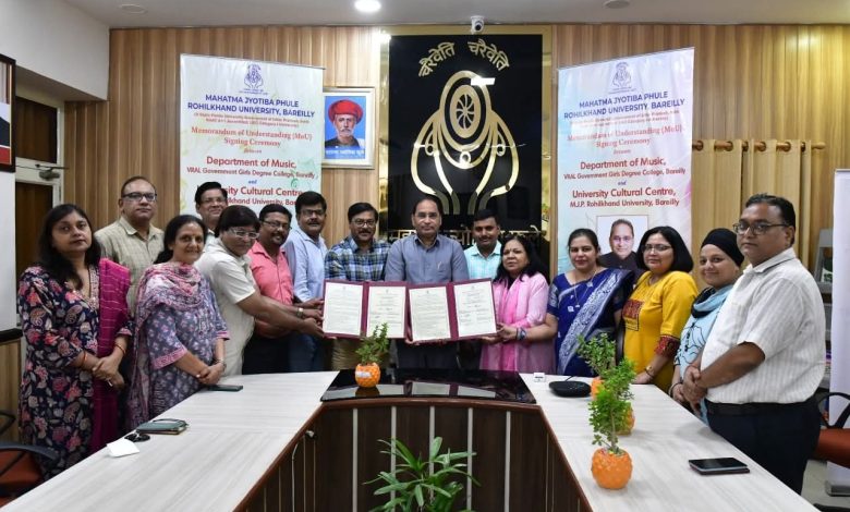 बरेली। महात्मा ज्योतिबा फुले रूहेलखंड विश्वविद्यालय, बरेली के विश्वविद्यालय सांस्कृतिक केंद्र और वी.आर.ए.एल. राजकीय महिला महाविद्यालय, बरेली के संगीत विभाग के बीच मंगलवार को एक महत्वपूर्ण समझौता ज्ञापन (MoU) हस्ताक्षरित किया गया। यह समझौता सांस्कृतिक आदान-प्रदान, प्रशिक्षण, शोध, और सामूहिक प्रतिभागिता को बढ़ावा देने की दिशा में एक ऐतिहासिक कदम माना जा रहा है।
