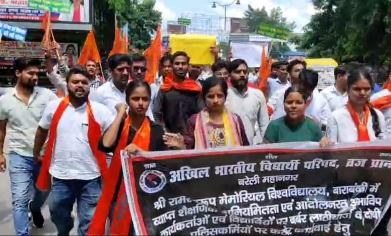 बरेली। अखिल भारतीय विद्यार्थी परिषद (एबीवीपी) ने बाराबंकी के रामस्वरूप मेमोरियल विश्वविद्यालय में हुए लाठीचार्ज के विरोध में बृहस्पतिवार को कलक्ट्रेट पहुंचकर प्रदर्शन किया। इसके बाद पदाधिकारियों ने सिटी मजिस्ट्रेट अलंकार अग्निहोत्री को ज्ञापन सौंपा। एबीवीपी कार्यकर्ताओं ने आरोप लगाया कि विश्वविद्यालय में शांतिपूर्ण प्रदर्शन कर रहे विद्यार्थियों और कार्यकर्ताओं पर