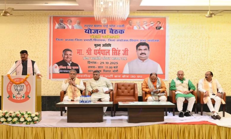 बरेली। भारतीय जनता पार्टी के प्रदेश महामंत्री (संगठन) धर्मपाल सिंह ने बुधवार को बरेली में पार्टी द्वारा भारत रत्न, लौह पुरुष और “एक भारत–श्रेष्ठ भारत” के शिल्पकार सरदार वल्लभभाई पटेल की 150वीं जयंती पर आयोजित होने वाले कार्यक्रमों की तैयारियों की समीक्षा बैठक की।